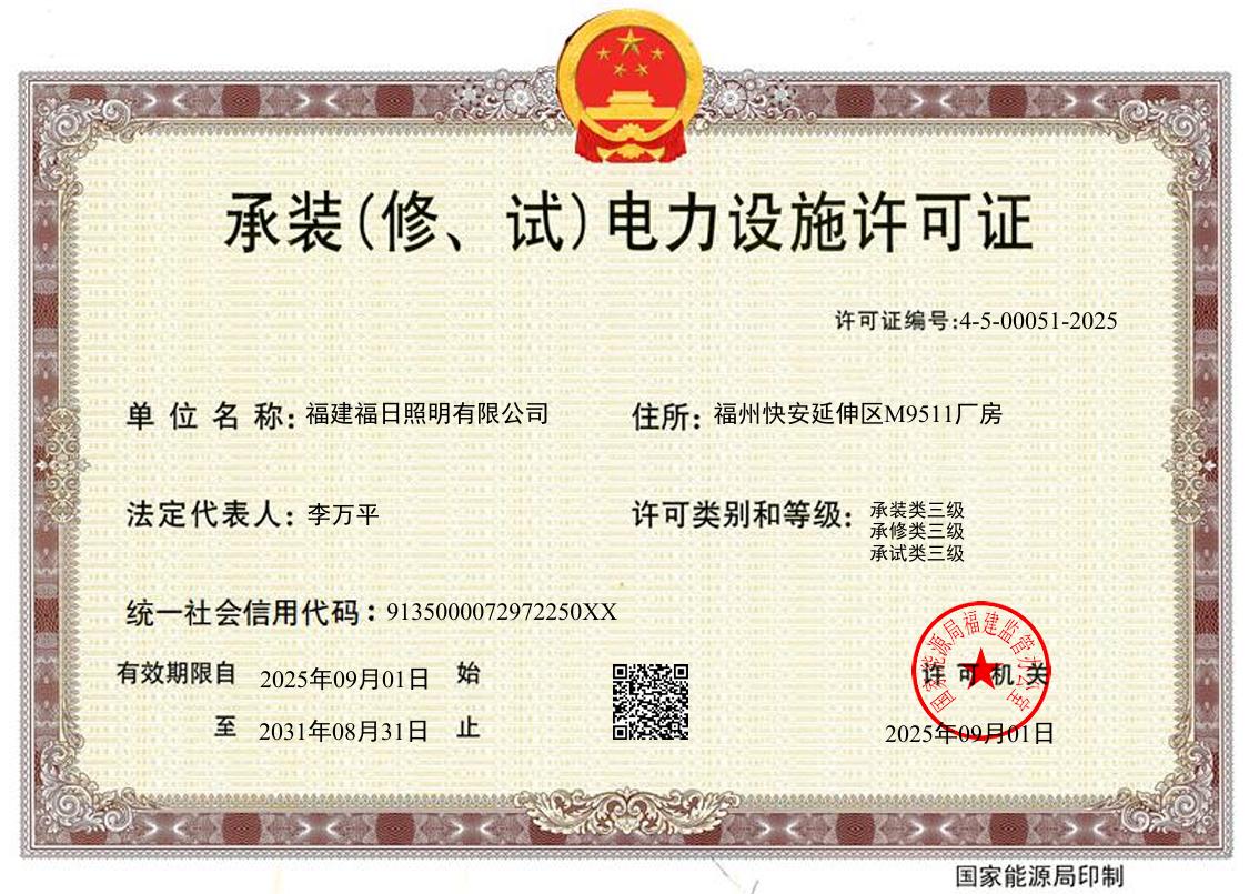 近日,经国家能源局福建监管办公室核准,福建福日照明有限公司成功取得承装(修、试)电力设施许可证三级资质,标志着福日照明已具备从事35kV以下电压等级电力设施的安装、维修和试验业务的全面能力。为福日照明在电力工程领域开拓市场提供了重要保障。